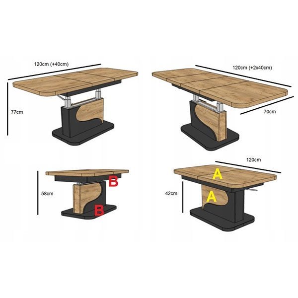Stalas transformeris pagamintas iš aukštos kokybės laminuotos plokštės , kurios storis 18 mm . Viršutinė dalis storinta net 36 mm. Stalviršio kraštai apdailinti PVC kraštu, apsaugančiu elementus nuo mechaninių pažeidimų. Stalas turi išskleidimo ir pakėlimo funkciją. Stalą transformerį labai lengva prižiūrėti ir valyti. Valymui tinka, bet kuri neagresyvi priežiūros priemonė skirta laminuotai plokštei. Tai ypatingai kokybiškas stalas kuris tarnaus ilgus dešimtmečius.