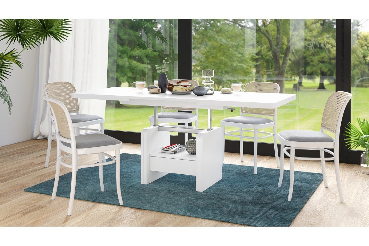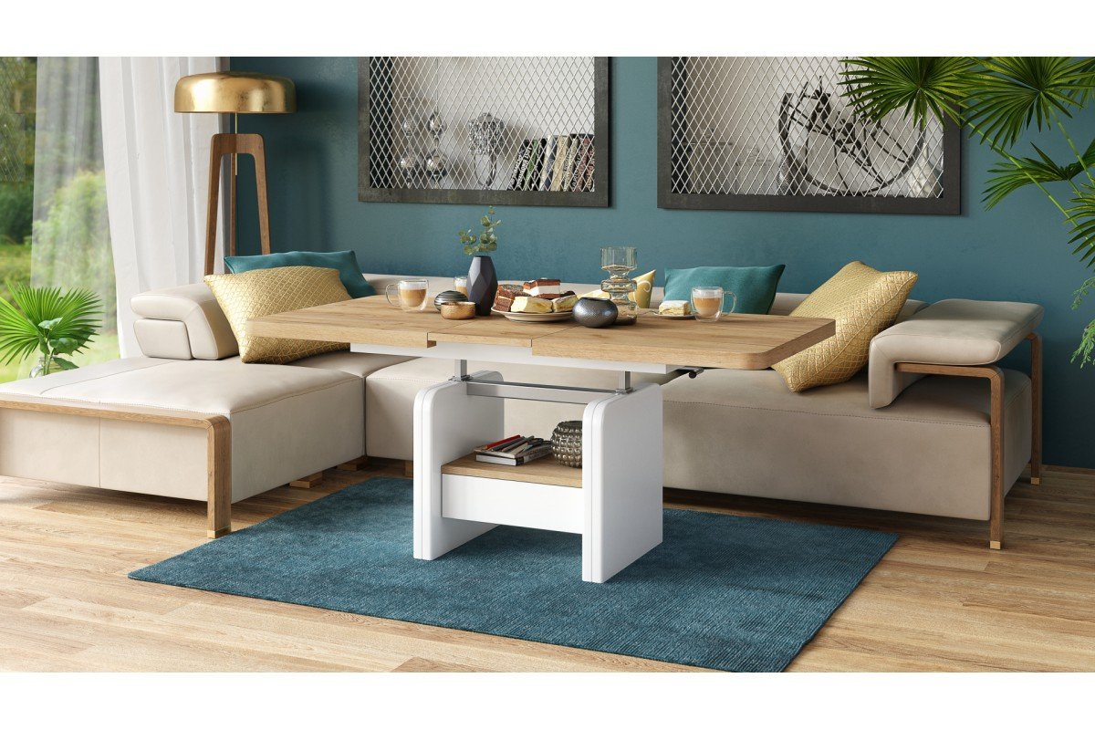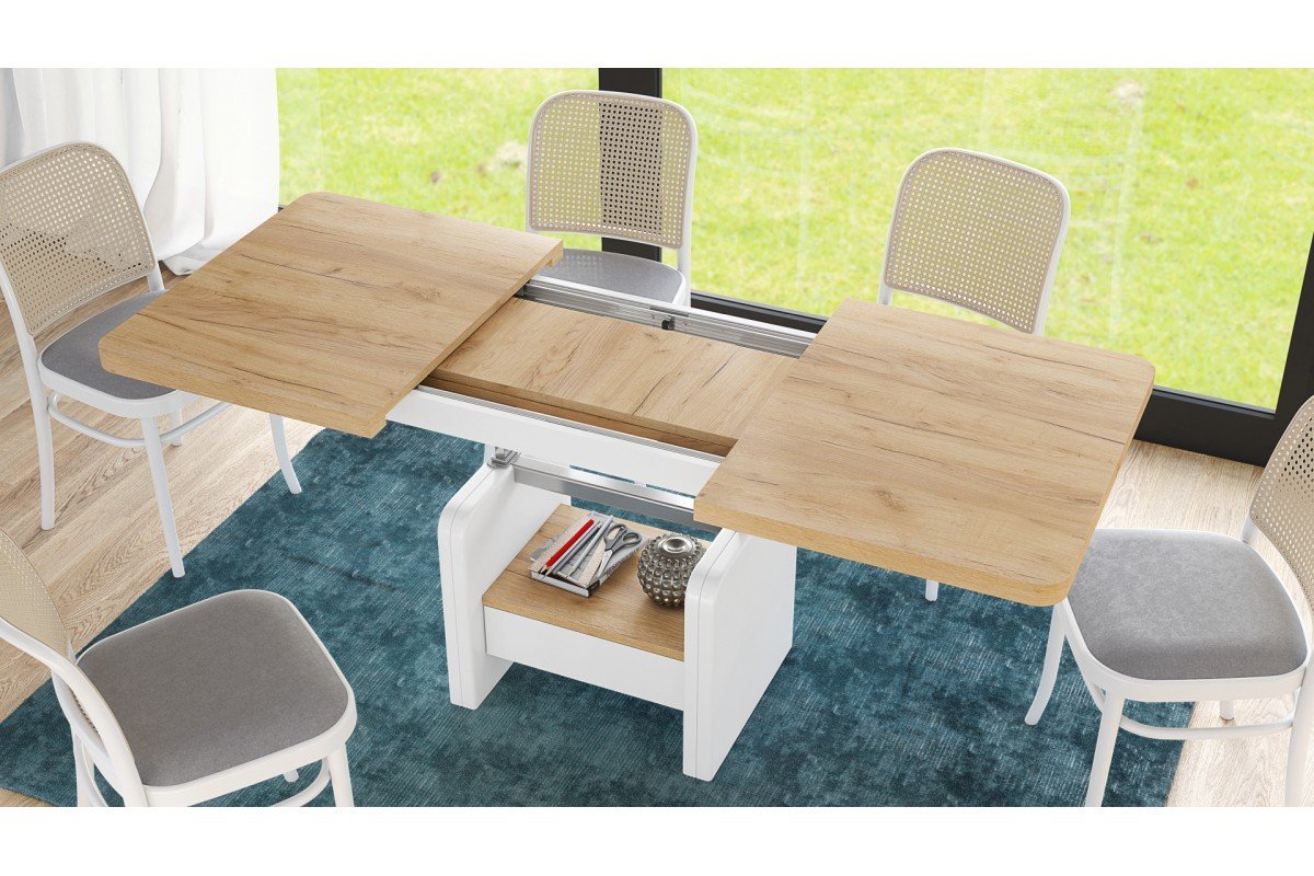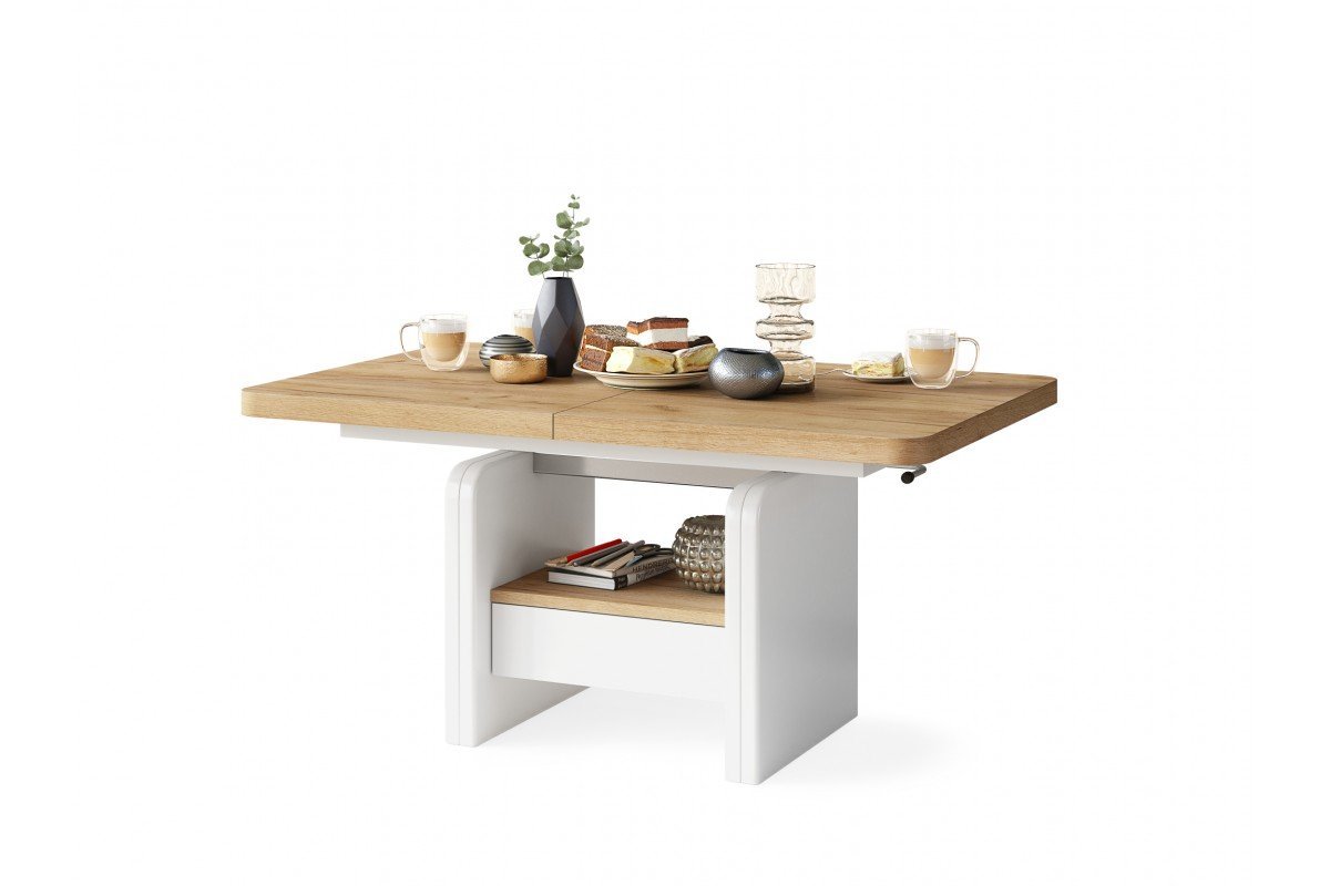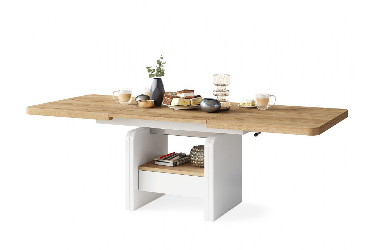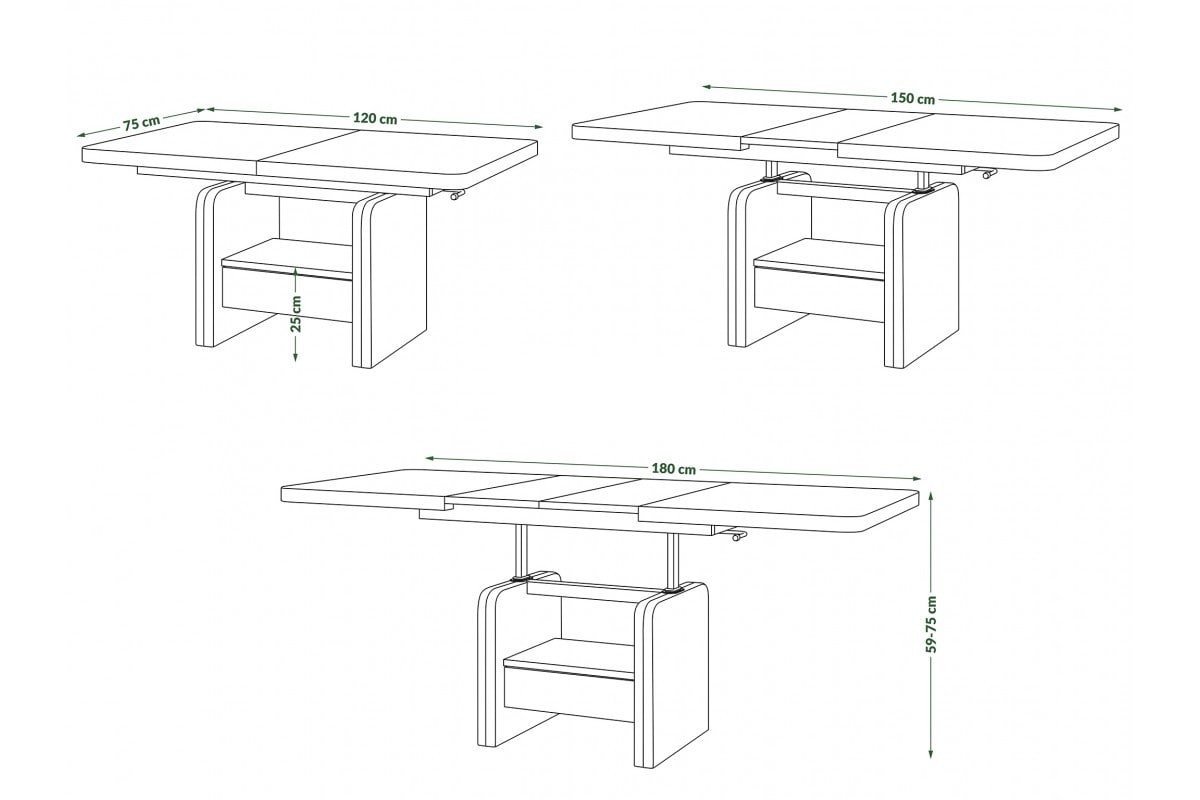 Stalas pagamintas iš 18 mm storio matinės medžio drožlių plokštės (laminuotos iš abiejų pusių) ir dvigubos 28 mm storio dažytos MDF plokštės (kojos). Visa apdaila su 2 mm ABS briauna. Be to, stalviršis turi iki 36 mm storintą šoną bei 2 įdėklus, kuriais galite keisti stalo ilgį. Aukštos kokybės milteliniu metodu dengta stalo kėlimo įranga užtikrina lengvą ir patogų stalviršio išskleidimą. Stalą transformerį labai lengva prižiūrėti ir valyti. Valymui tinka, bet kuri neagresyvi priežiūros priemonė skirta laminuotai plokštei.