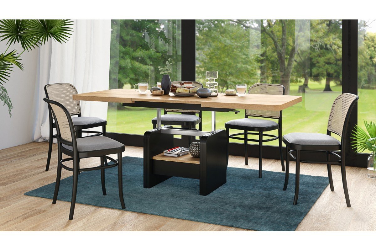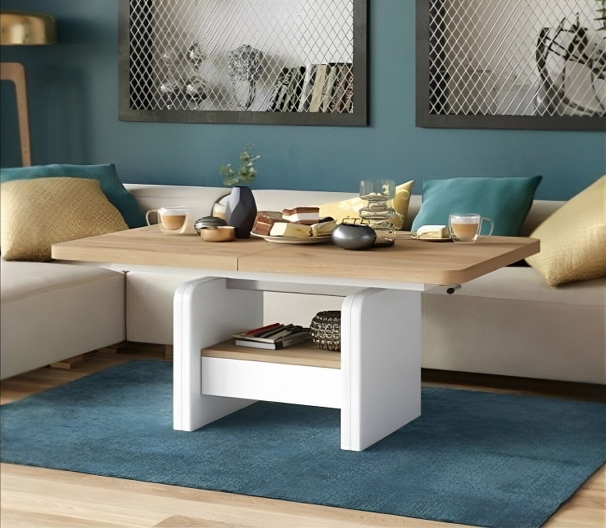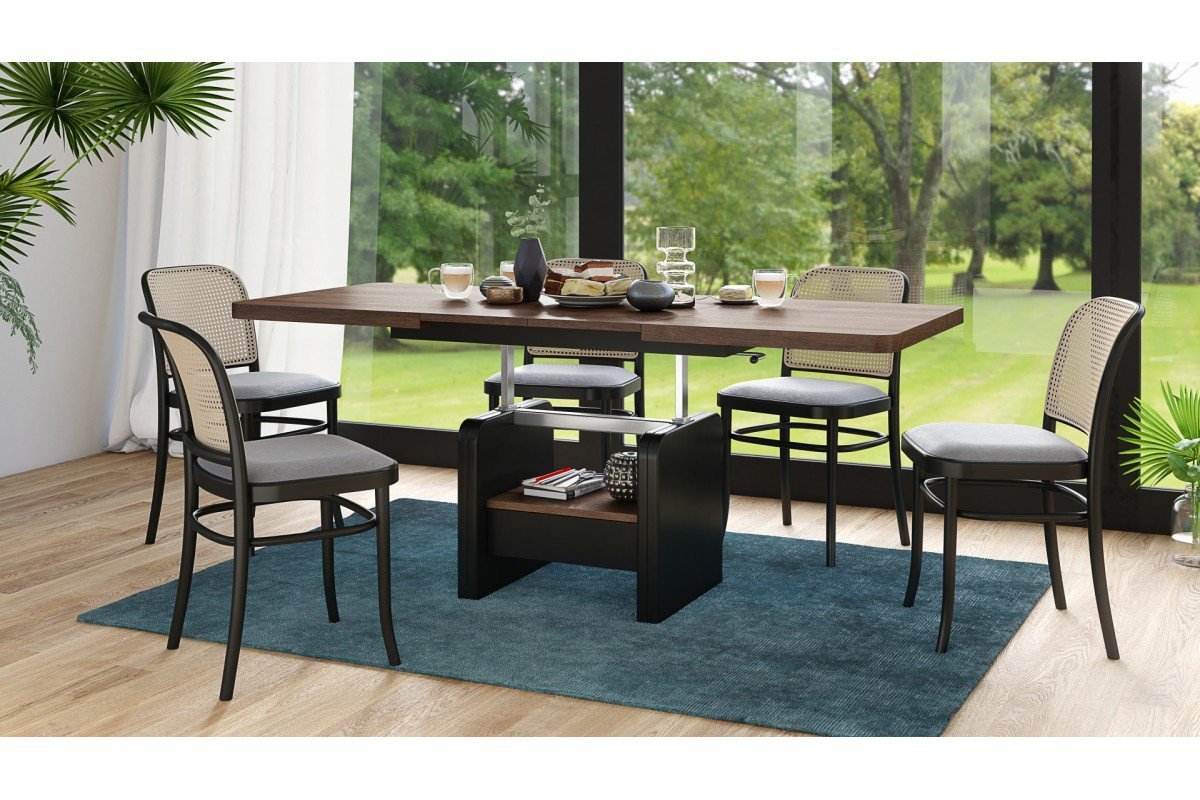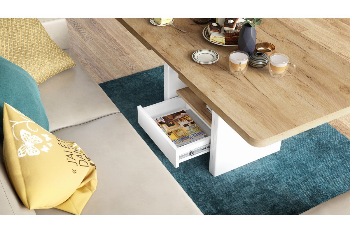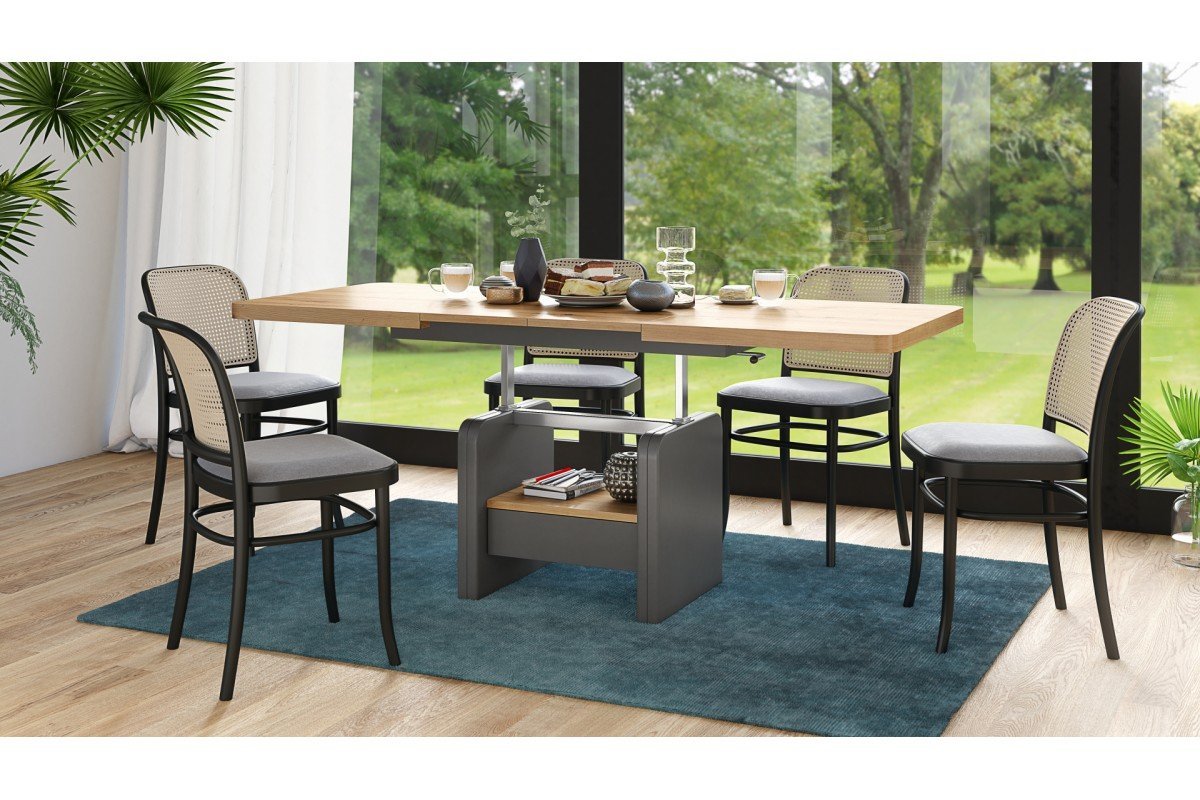 Stalas pagamintas iš 18 mm storio matinės medžio drožlių plokštės (laminuotos iš abiejų pusių) ir dvigubos 28 mm storio dažytos MDF plokštės (kojos). Visa apdaila su 2 mm ABS briauna. Be to, stalviršis turi iki 36 mm storintą šoną bei 2 įdėklus, kuriais galite keisti stalo ilgį. Aukštos kokybės milteliniu metodu dengta stalo kėlimo įranga užtikrina lengvą ir patogų stalviršio išskleidimą. Stalą transformerį labai lengva prižiūrėti ir valyti. Valymui tinka, bet kuri neagresyvi priežiūros priemonė skirta laminuotai plokštei.